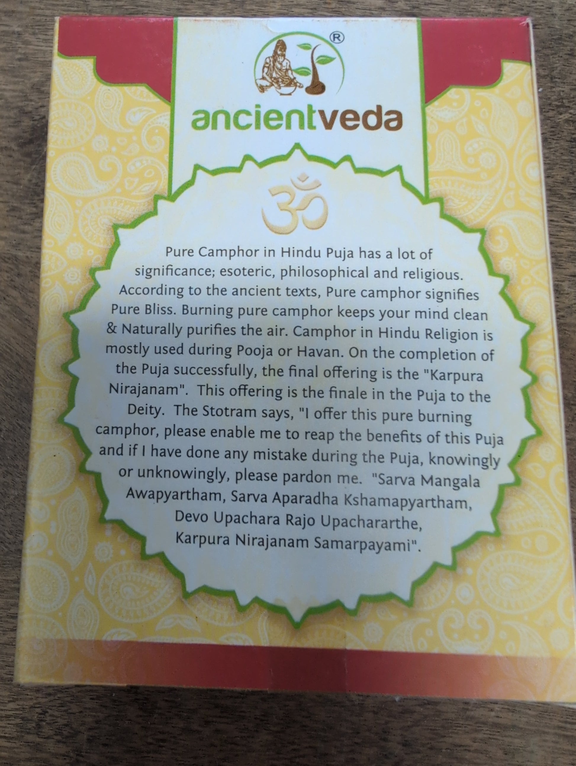 Pure Camphor in Hindu Puja has a lot of significance; esoteric, philosophical and religious. According to the ancient texts, pure camphor signifies Pure Bliss. Burning pure camphor keeps your mind clean & naturally purifies the air. Camphor in Hindu religion is mostly used during Pooja or Havan. On the completion of the Puja successfully, the final offering is the "Karpura Nirajanam". This offering is the finale in the Puja to the Deity. The Stotram says, "Ioffer this pure burning camphor, please enable me to reap the benefits of this Puja and if I have done any mistake during the Puja, knowingly or unknowingly, please pardon me."
