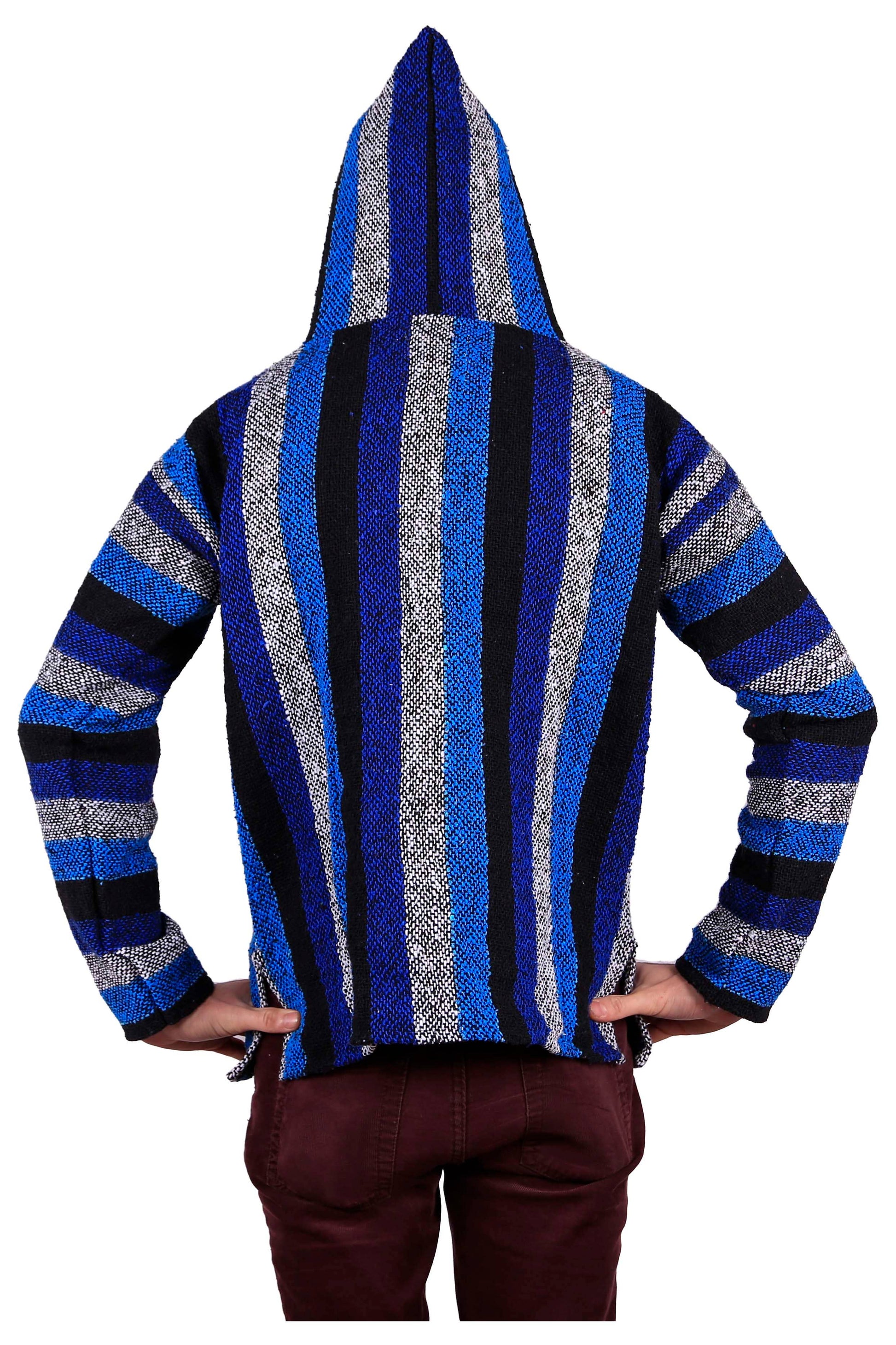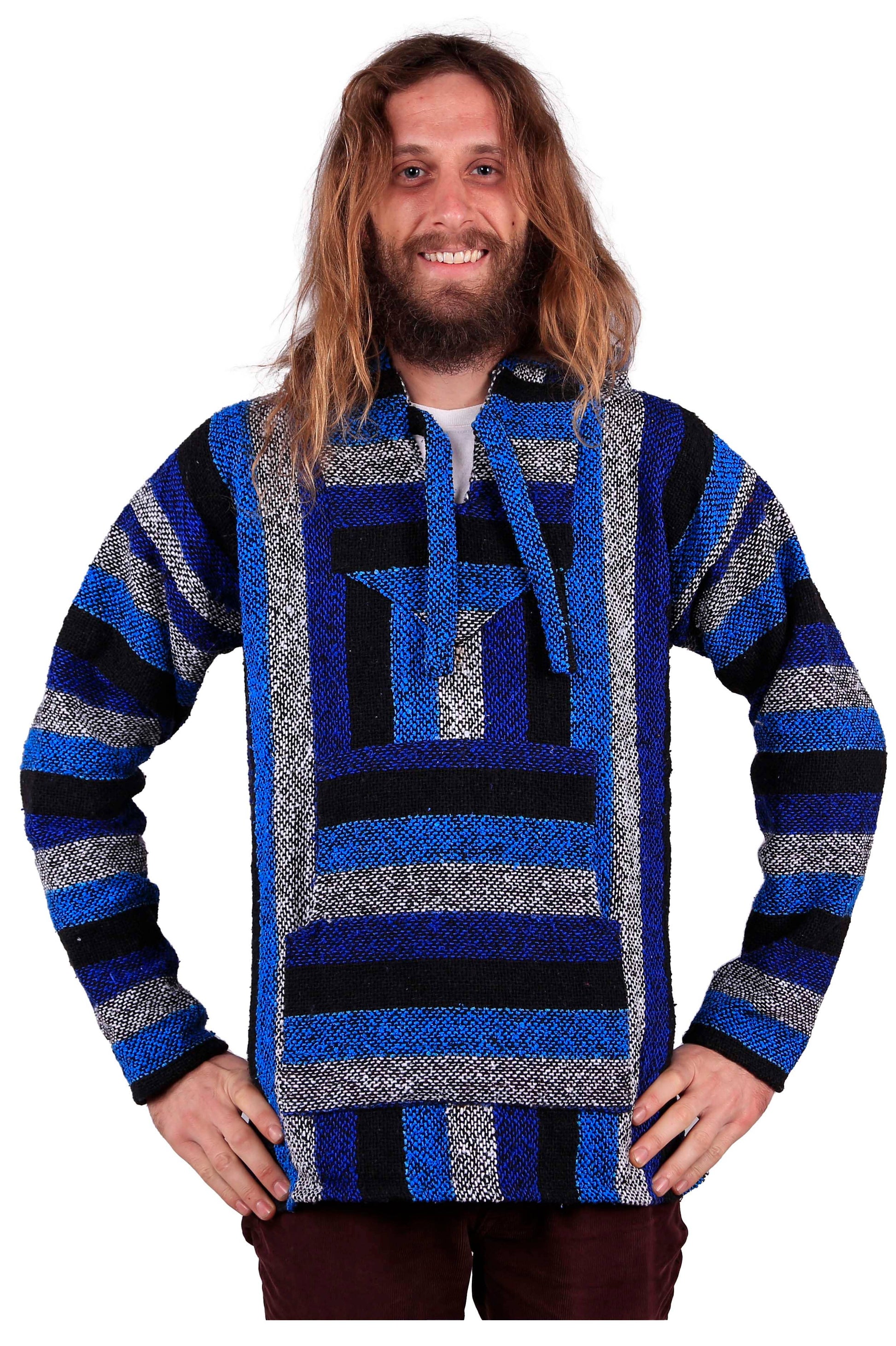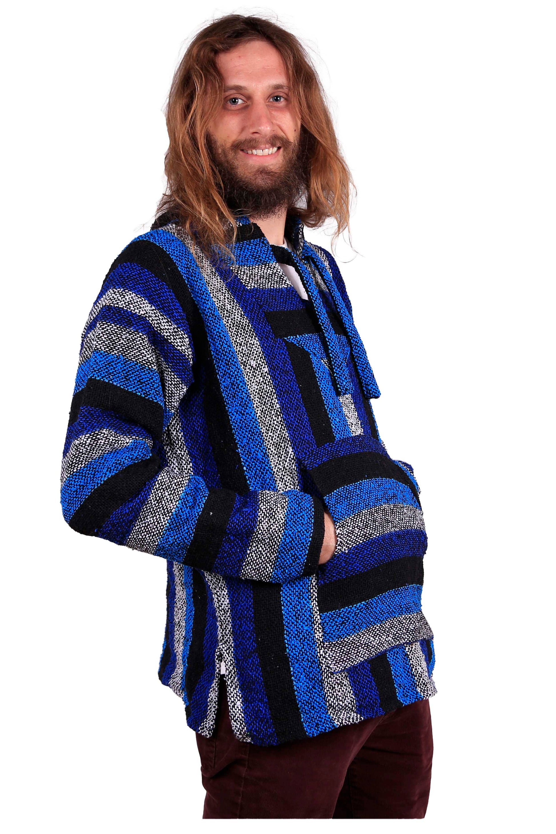 Embrace the laid-back, bohemian spirit with our Sunshine Joy Blue Striped Pullover Baja. Handcrafted in Mexico, this Baja jacket is a masterpiece of warmth and comfort. Each Baja is unique, thanks to the inherent shade and color variations in its recycled fiber composition, making it as distinctive as the individual wearing it. Available in sizes Small through 3X, Care Instructions: Machine wash cold, gentle cycle. Tumble dry low. Features: Soft Comfort: The interior of the Baja is brushed to perfection, ensuring a super soft and comfortable feel against your skin. It's like wearing a warm hug. Eco-Friendly: We care about the environment, and that's why this Baja is made using recycled fibers. The composition is 50% Polyester, 40% Acrylic, and 10% Cotton, making it an eco-conscious choice.