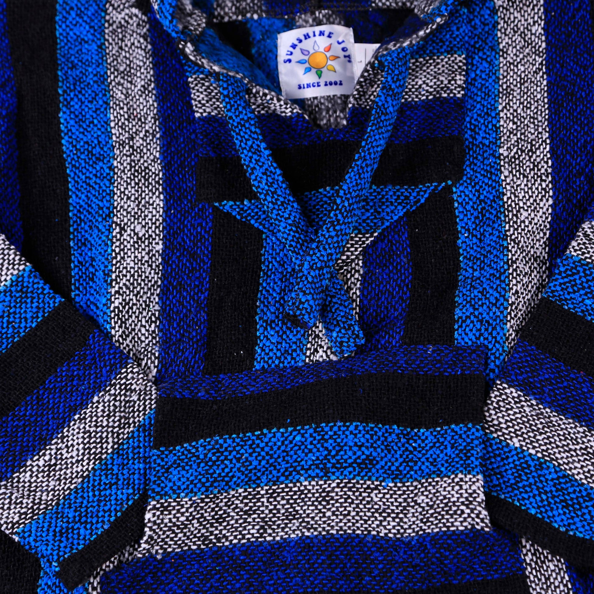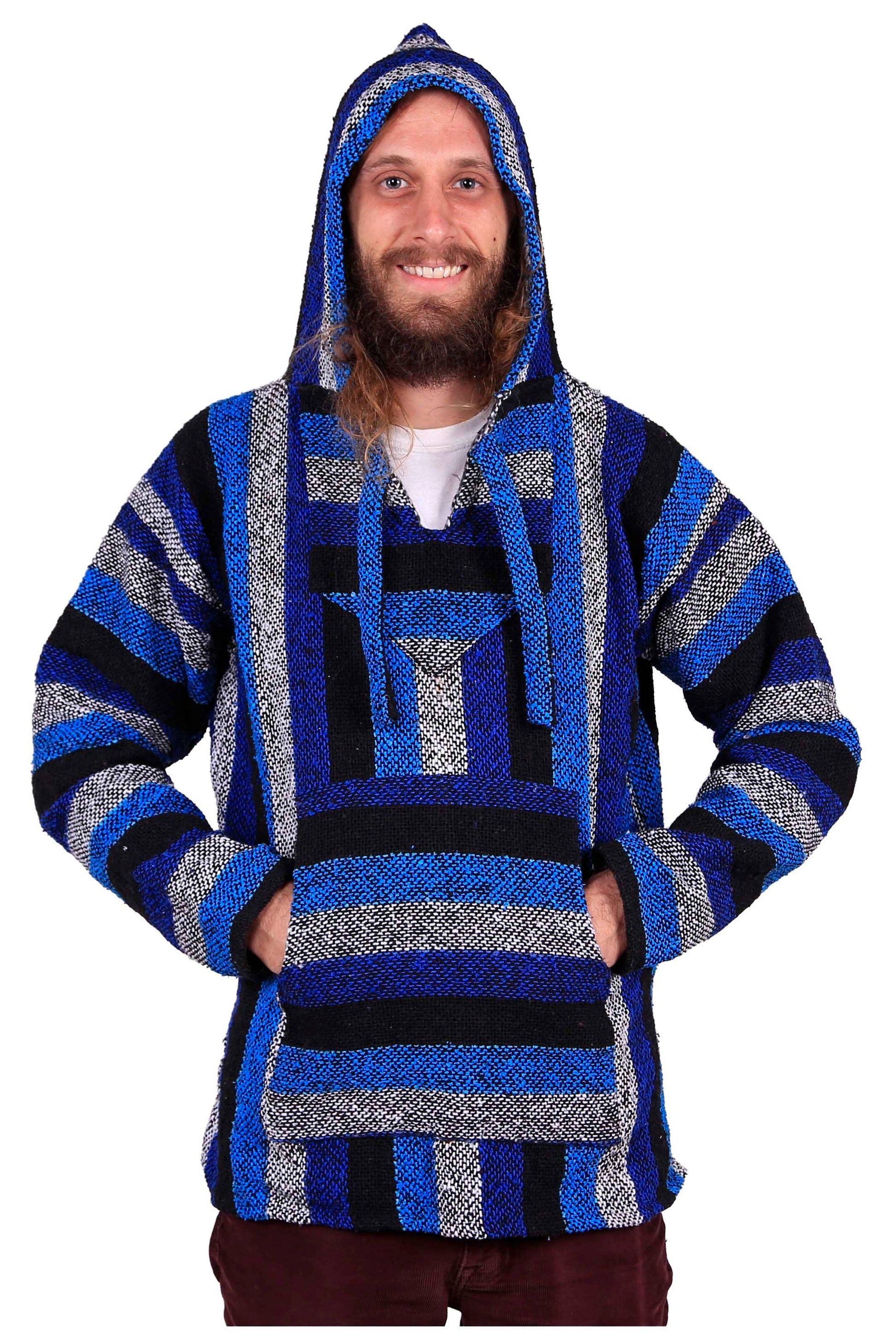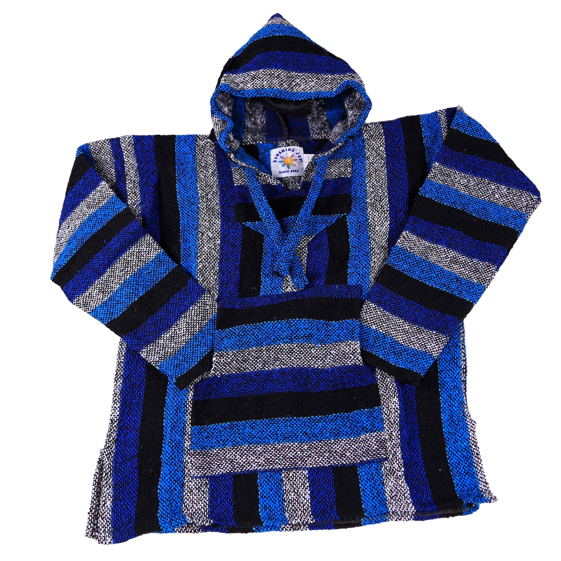 Embrace the laid-back, bohemian spirit with our Sunshine Joy Blue Striped Pullover Baja. Handcrafted in Mexico, this Baja jacket is a masterpiece of warmth and comfort. Each Baja is unique, thanks to the inherent shade and color variations in its recycled fiber composition, making it as distinctive as the individual wearing it. Available in sizes Small through 3X, Care Instructions: Machine wash cold, gentle cycle. Tumble dry low. Features: Soft Comfort: The interior of the Baja is brushed to perfection, ensuring a super soft and comfortable feel against your skin. It's like wearing a warm hug. Eco-Friendly: We care about the environment, and that's why this Baja is made using recycled fibers. The composition is 50% Polyester, 40% Acrylic, and 10% Cotton, making it an eco-conscious choice.