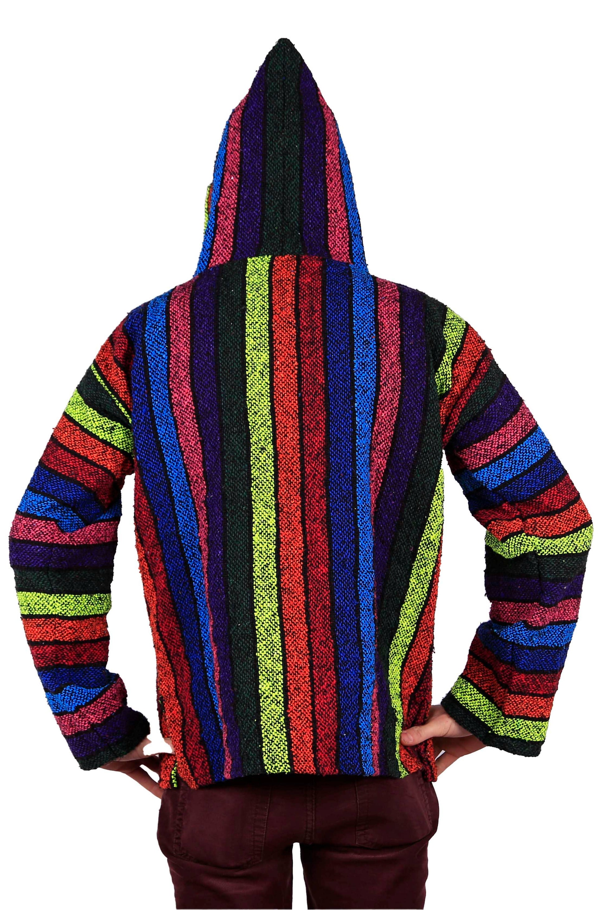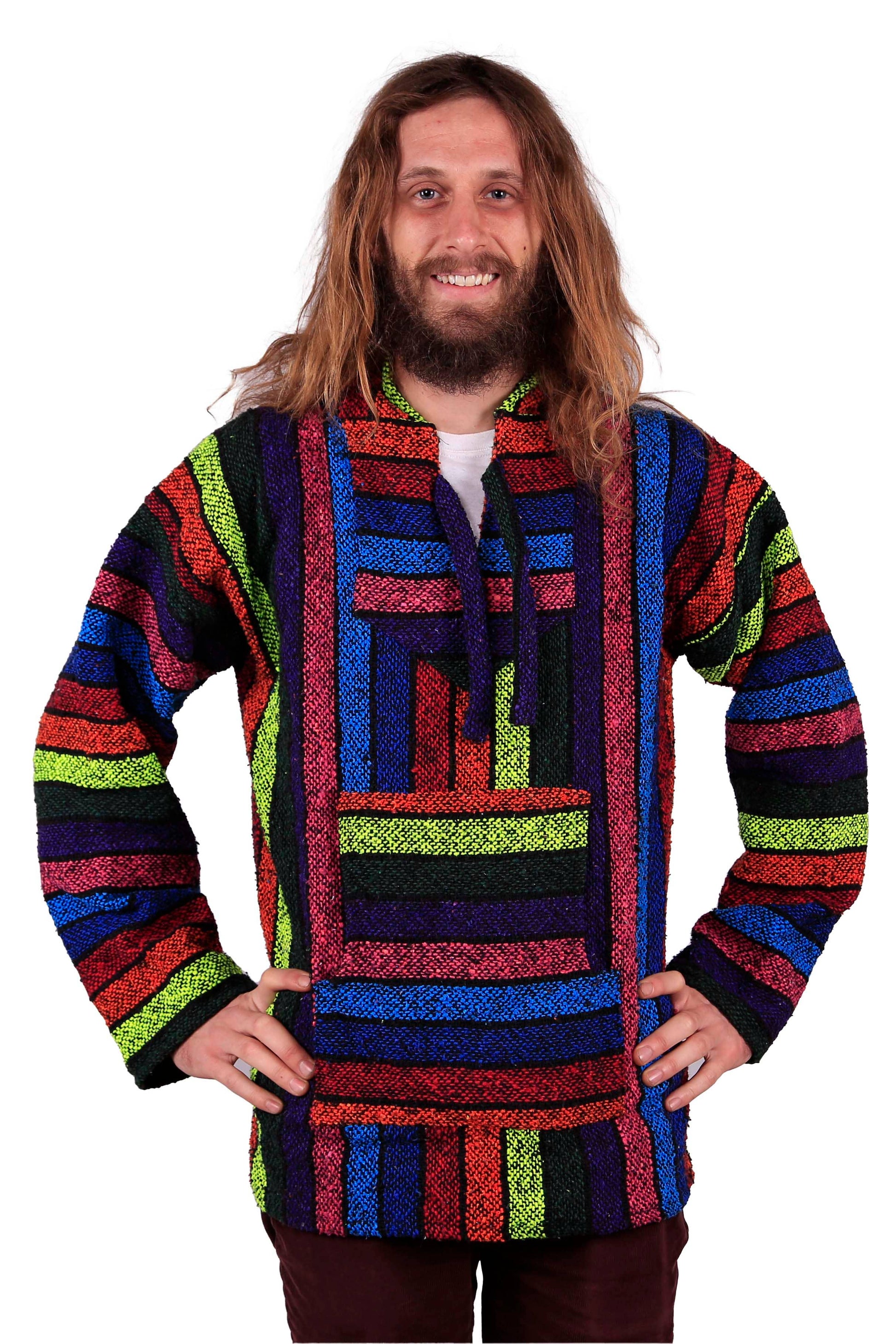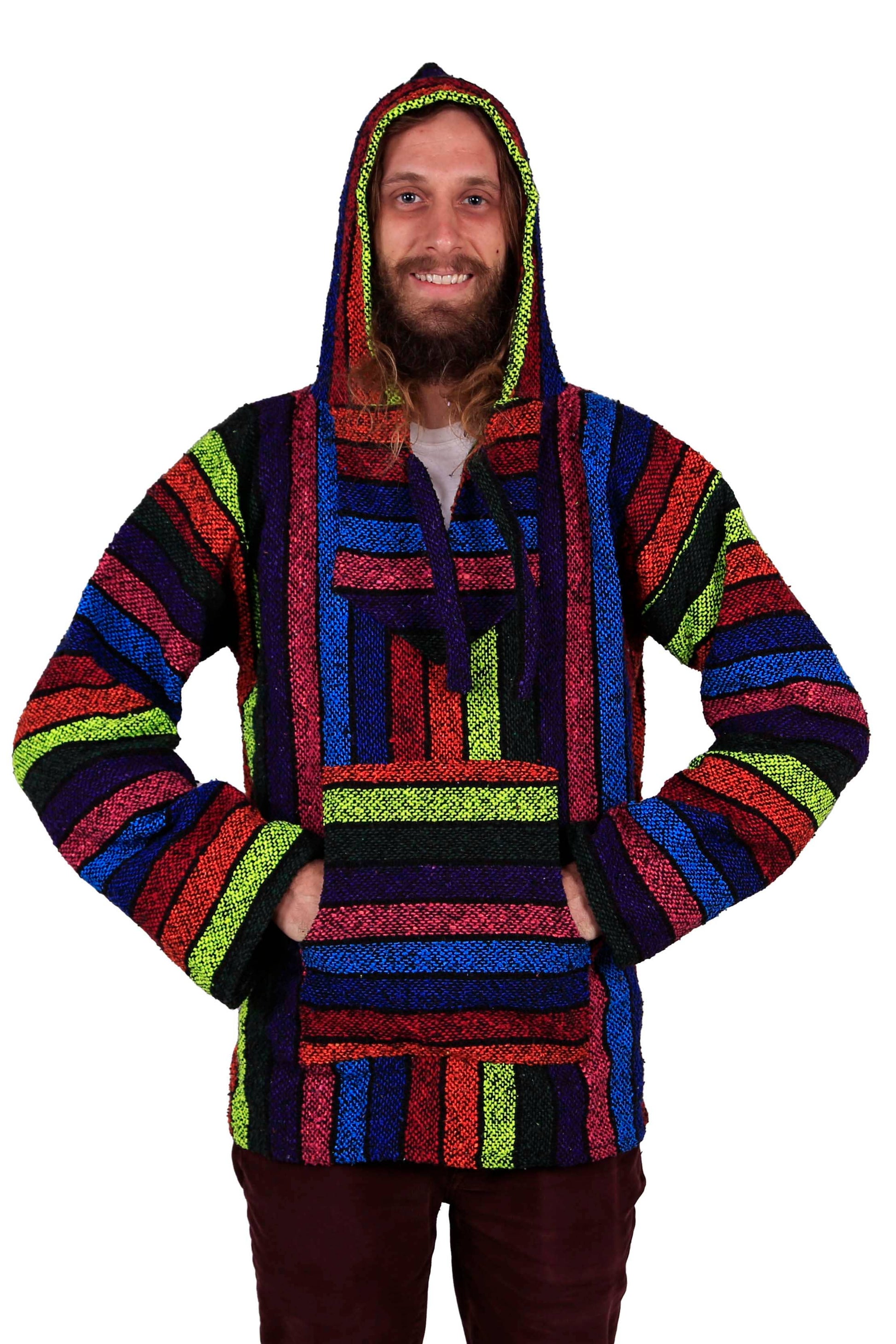 Embrace the laid-back, bohemian spirit with our Sunshine Joy Striped Pullover Baja in Neon Rainbow. Handcrafted in Mexico, this Baja jacket is a masterpiece of warmth and comfort. Each Baja is unique, thanks to the inherent shade and color variations in its recycled fiber composition, making it as distinctive as the individual wearing it. Available in sizes Small through 3X, Care Instructions: Machine wash cold, gentle cycle. Tumble dry low. Features: Soft Comfort: The interior of the Baja is brushed to perfection, ensuring a super soft and comfortable feel against your skin. It's like wearing a warm hug. Eco-Friendly: We care about the environment, and that's why this Baja is made using recycled fibers. The composition is 50% Polyester, 40% Acrylic, and 10% Cotton, making it an eco-conscious choice. Elevate your style with the Sunshine Joy Striped Pullover Baja.