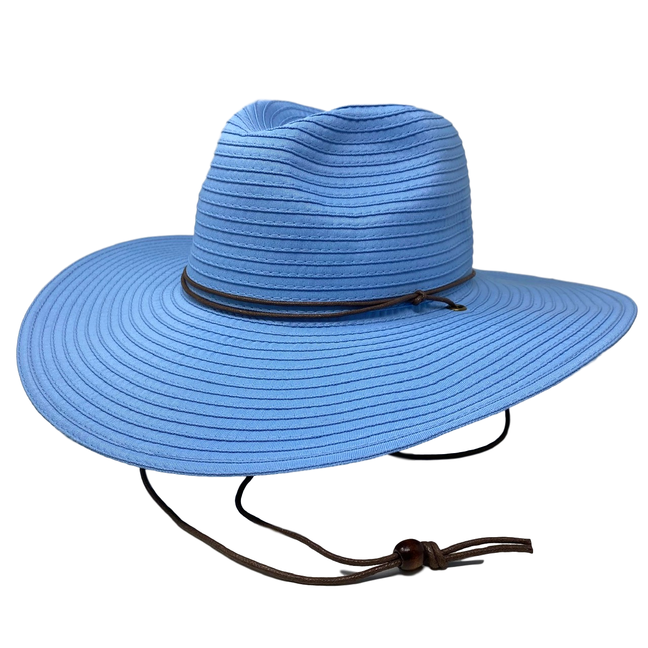 The Skylar crushable lady’s fedora is versatility and style wrapped up in an inexpensive, yet quality package. The tightly bound fabric stops UV rays in their tracks all the while allowing that sumptuous summer breeze to roll right in due to its lightweight construction. The 4” brim covers your neck and shoulders and the faux leather stampede strap ensures that it will stay firmly affixed to your head in the case of a rogue gust. Available in a soft blue and a robust tan, the Skylar is a worthwhile purchase.