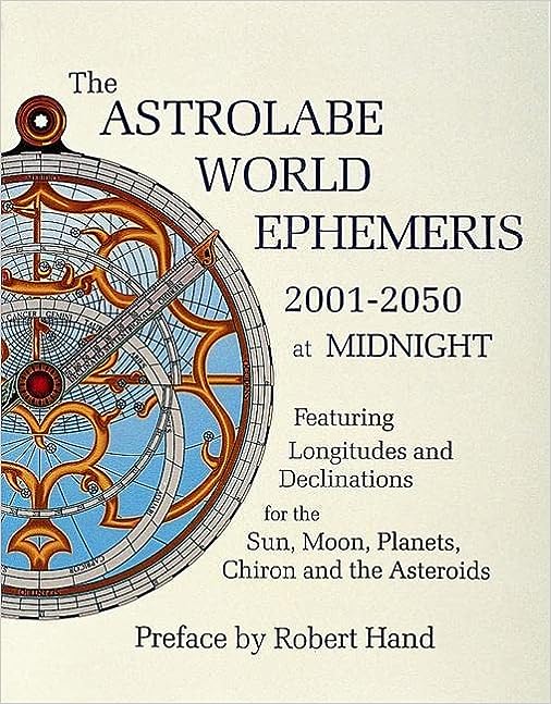 Featuring Longitudes and Declinations for the Sun, Moon, Planets, Chiron and the Asteroids. The Astrolabe World Ephemeris combines reading ease and clarity with 21st Century accuracy and precision of data. This unique ephemeris is one of the most complete and convenient references available for astrological calculation. Includes: daily longitudes and declinations for the planets calculated to the second of arc, Chiron and the four major asteroids, void-of-course Moon data, 12 hour Moon positions, Monthly planetary and Lunar ingresses, Lunar phases and an introduction by Robert Hand.