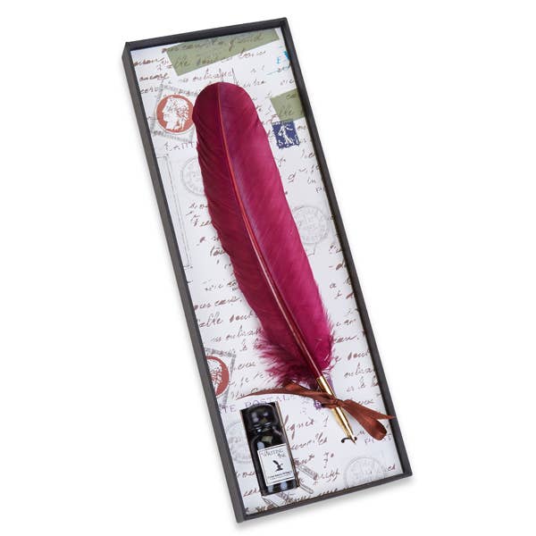 Turkey Feather Quill Pen and Ink Gift Set, made from naturally shed feathers, organically dyed and hand assembled in England. Pen is approximately 12" in length and is fitted with a gold nib for an easy and graceful flow. Paired in a gift presentation box with our Italian Apothecary Writing Ink . A wonderful gift for writers of all ages, and especially Harry Potter fans. Four different pen colors available-all boxed with black ink. This item is shipped in a gift-box, 14" long and 4" wide.