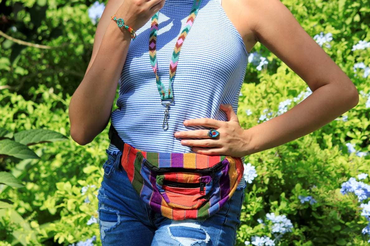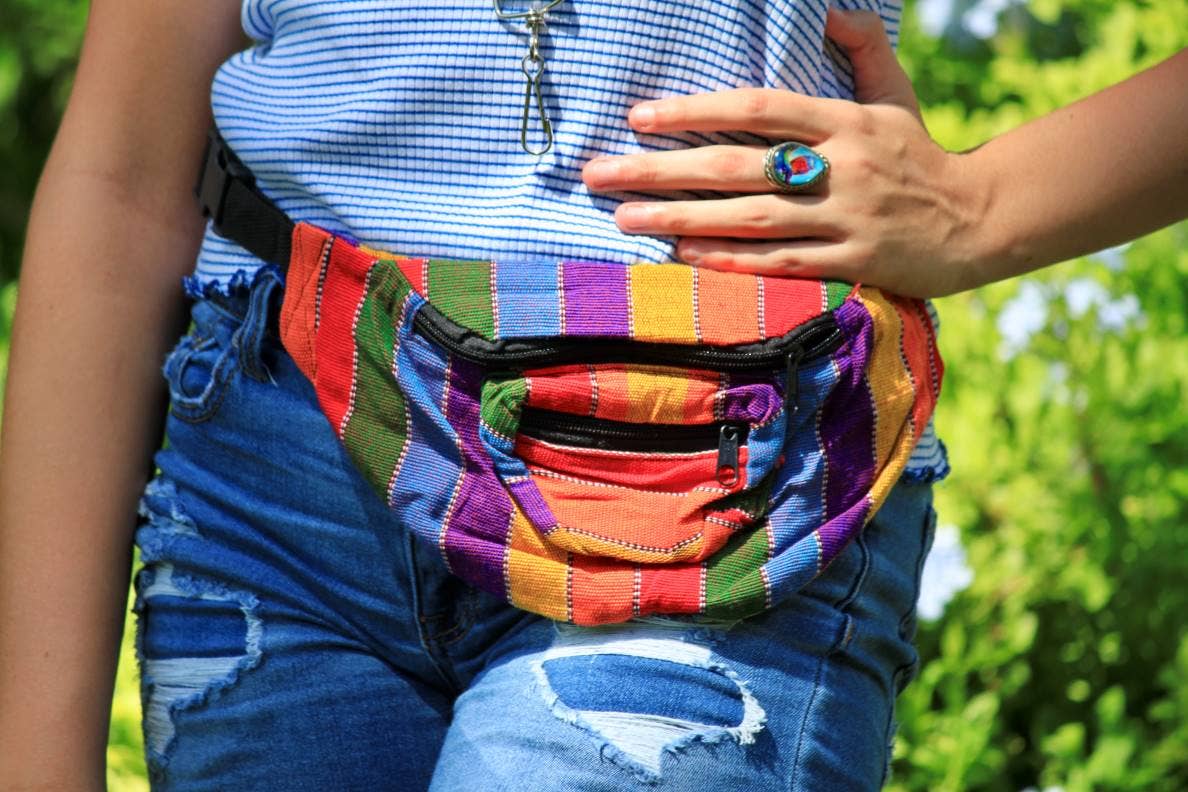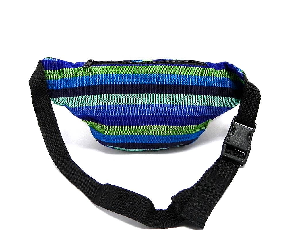 Woven fanny pack hip bag with multicolored striped pattern material. Bag is woven with lightweight cotton material. Black buckle waist strap is adjustable for a comfortable fit.